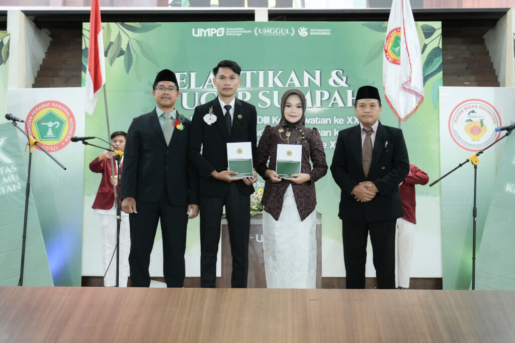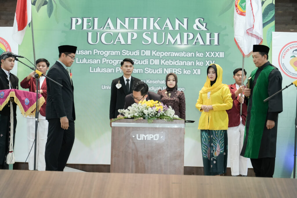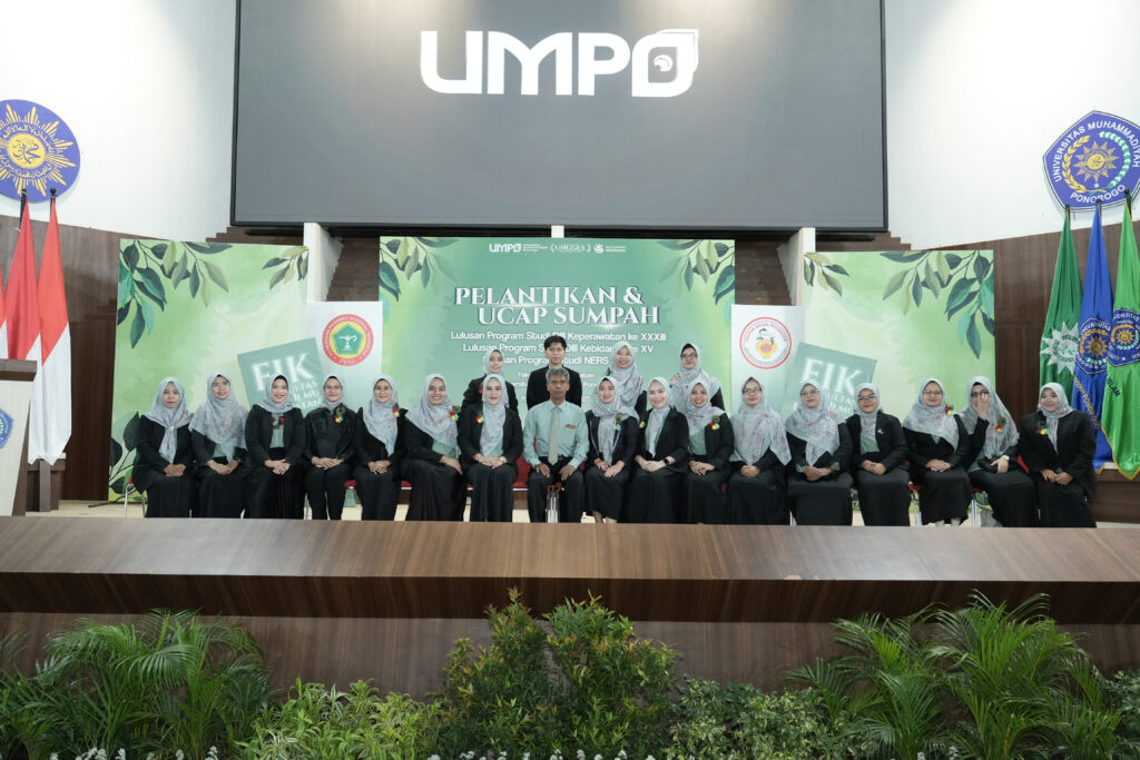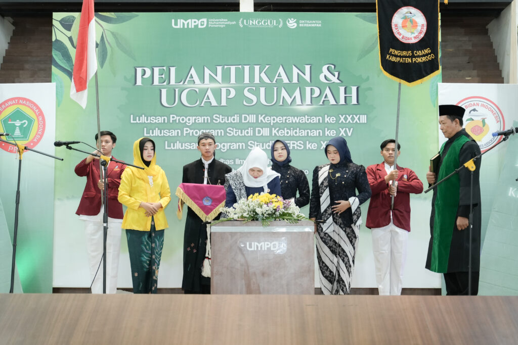 Pada hai selasa, 18 November 2025 bertempat di Expotorium Universitas Muhammadiyah Ponorogo dalam rangkaian Pelantikan dan Ucap Sumpah Lulusan Program Studi DIII Keperawatan ke XXXIII, Lulusan Program Studi Ners ke XII dan Lulusan DIII Kebidanan ke XV. Prosesi pelatihan dan ucap sumpah diikuti oleh 97 lulusan Program Studi DIII Keperawatan, 53 lulusan Program Studi Ners, dan 19 lulusan Program Studi DIII Kebidanan yang dipimpin oleh Dekan Fakultas Ilmu Kesehatan UMPO, Saiful Nurhidayat, S.Kep.,Ns.,M.Kep, yang dihadiri oleh Wakil Rektor 1 Universitas Muhammadiyah Ponorogo, BPH, Ketua DPW PPNI Jawa Timur, Ketua DPD PPNI Ponorogo, Ketua DPW IBI Jawa Timur, Ketua DPD IBI Jawa Timur, Ka. Dinas Kesehatan, dan Rohaniawan dari Kemenag Kabupaten Ponorogo.